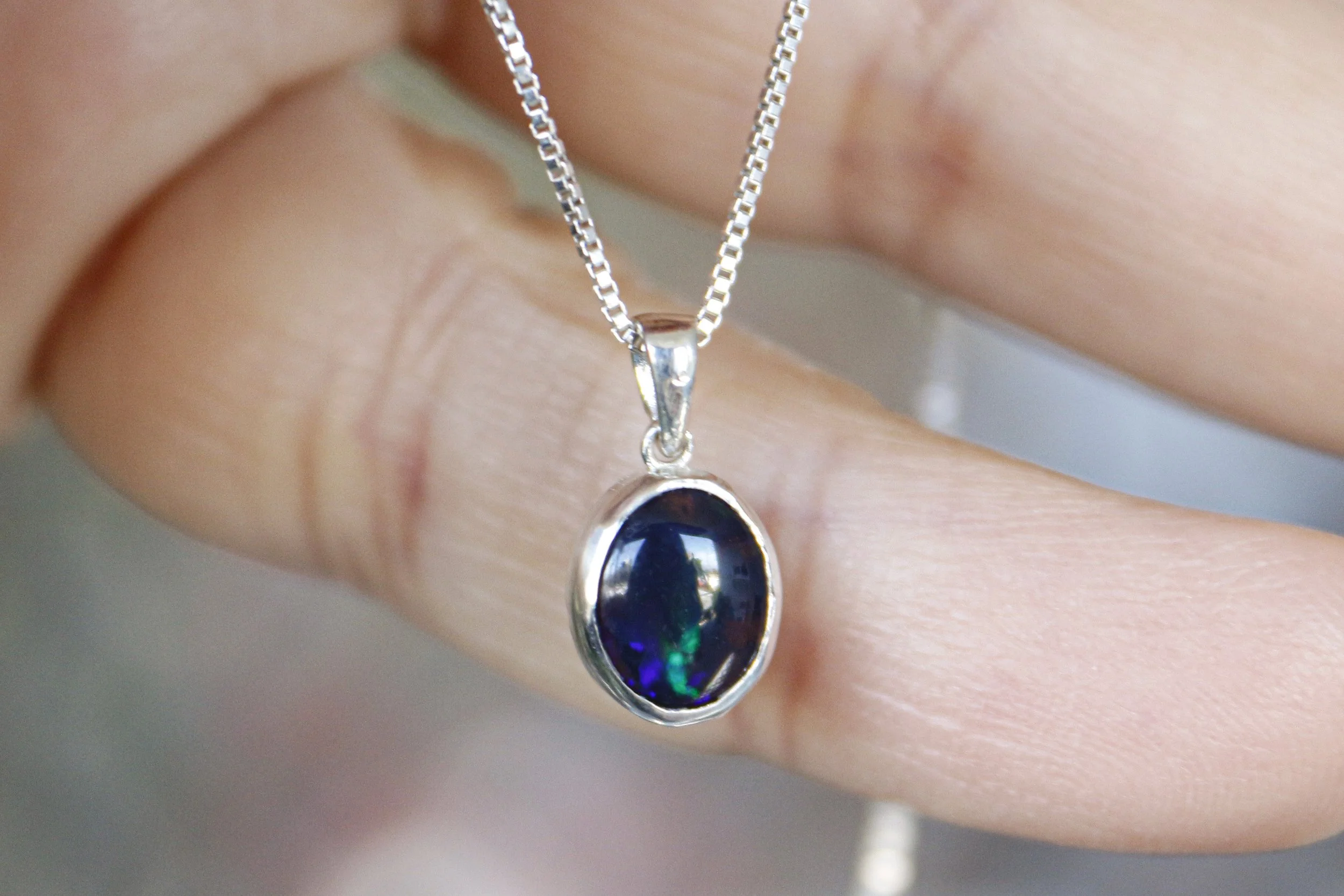 I hope you can find yours within this Australian black opal set in sterling silver. This is a genuine, untreated Australian black opal. The pendant measures approximately 7mm x 8mm. Included is an 18" box chain, also made of sterling silver.